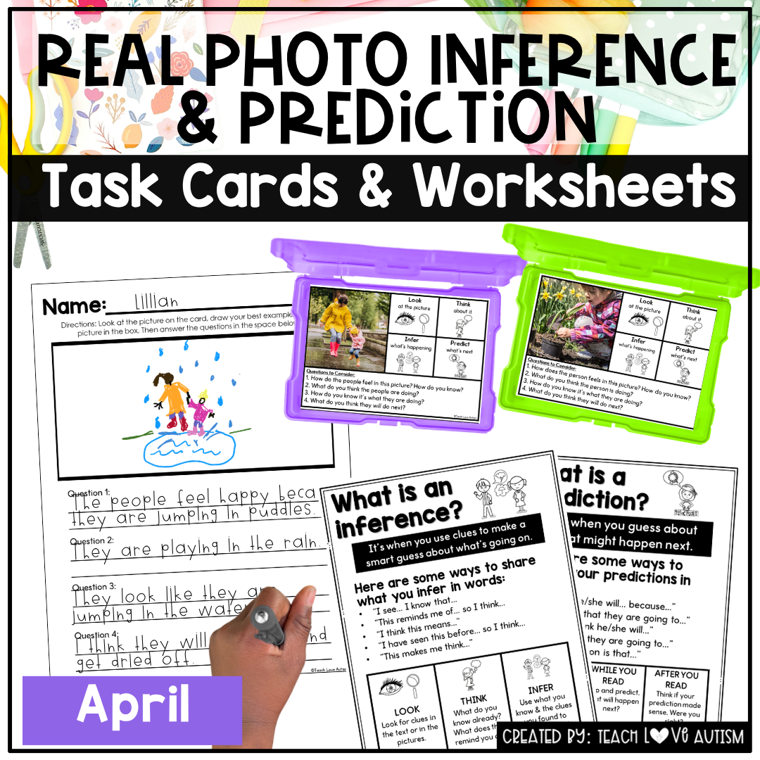 Strengthen inferencing and prediction skills this spring season with engaging, real-photo based practice that bring April themes to life! Perfect for early learners and special education classrooms, these task cards and worksheets help students make connections, draw conclusions, and practice higher-level thinking using seasonal visuals.