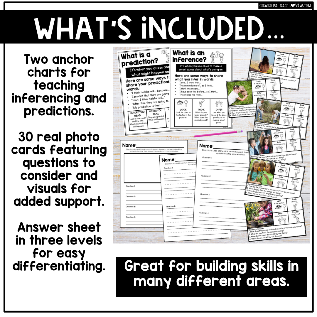 Build inferencing & prediction skills with April Real Photo Predict & Infer Task Cards and Worksheets. Spring and outdoor themes using real photos, anchor charts, and differentiated answer sheets included!
