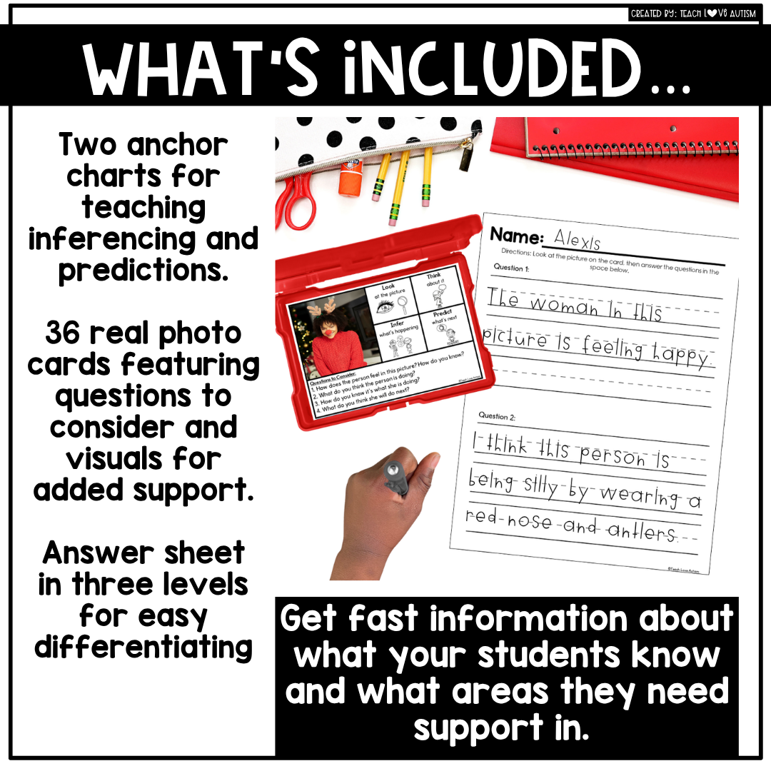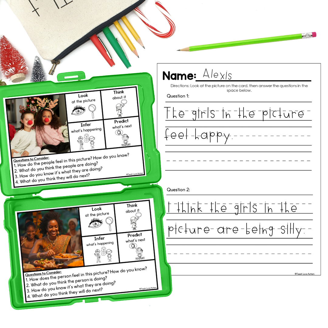 Strengthen inferencing and prediction skills this winter and holiday season with engaging, real-photo based practice that bring December themes to life! Perfect for early learners and special education classrooms, these task cards and worksheets help students make connections, draw conclusions, and practice higher-level thinking using seasonal visuals.
