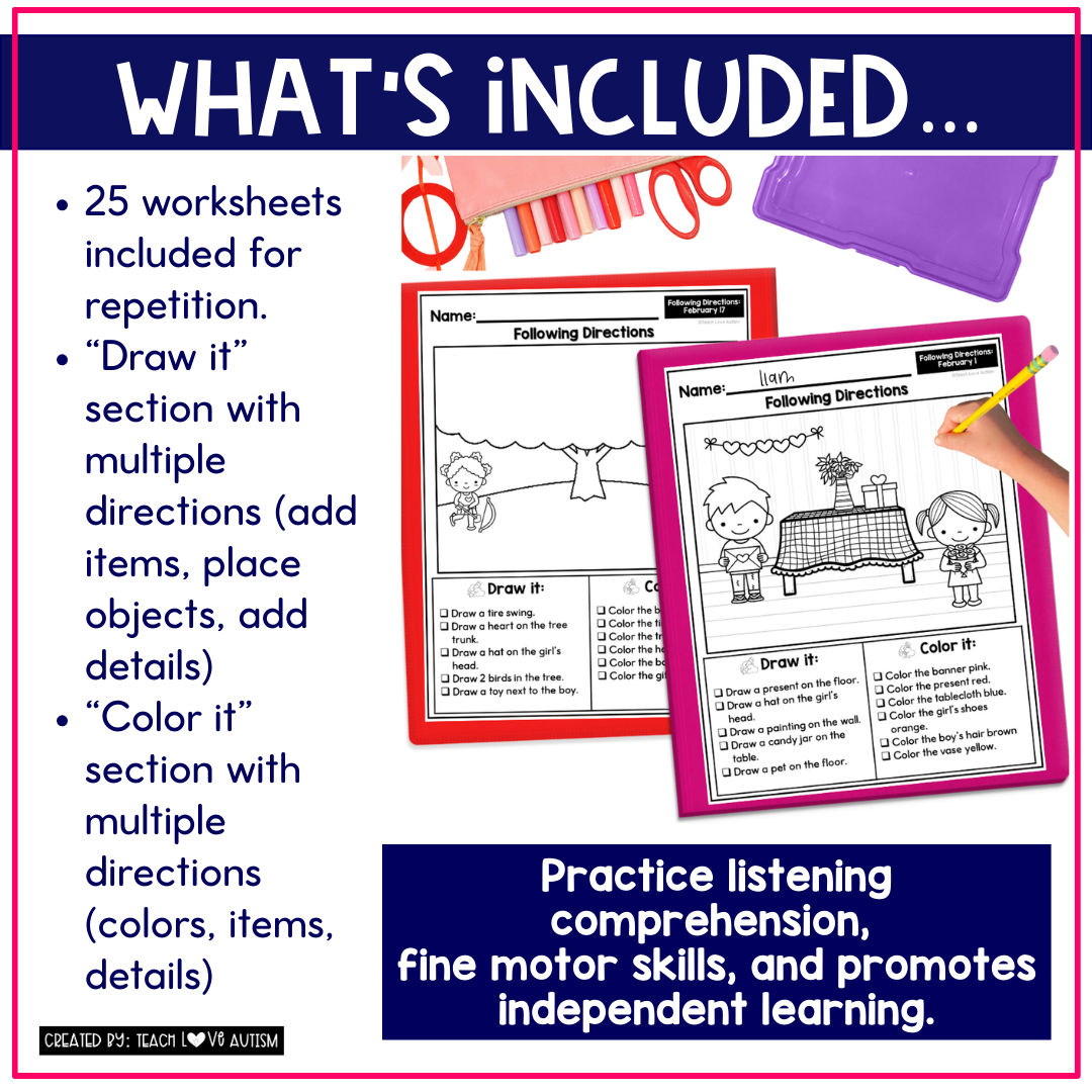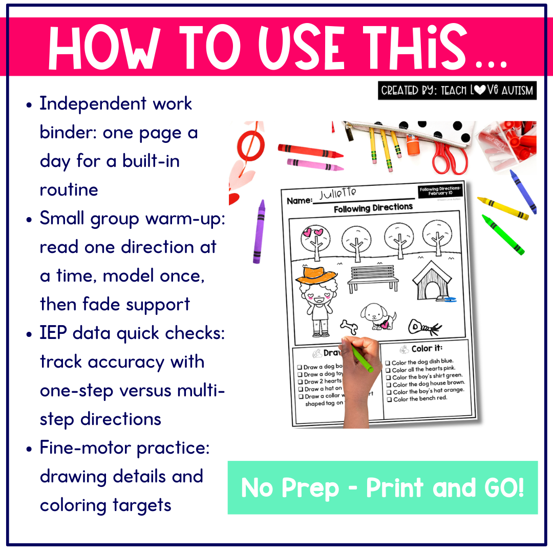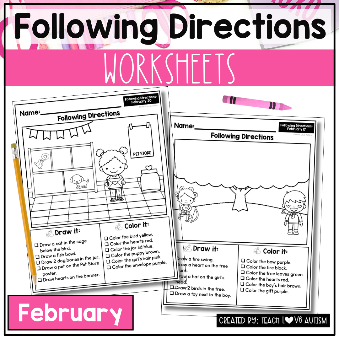 These February Following Directions Worksheets are a simple, effective way to reinforce essential classroom and life skills while providing structure, repetition, and seasonal fun for your students.