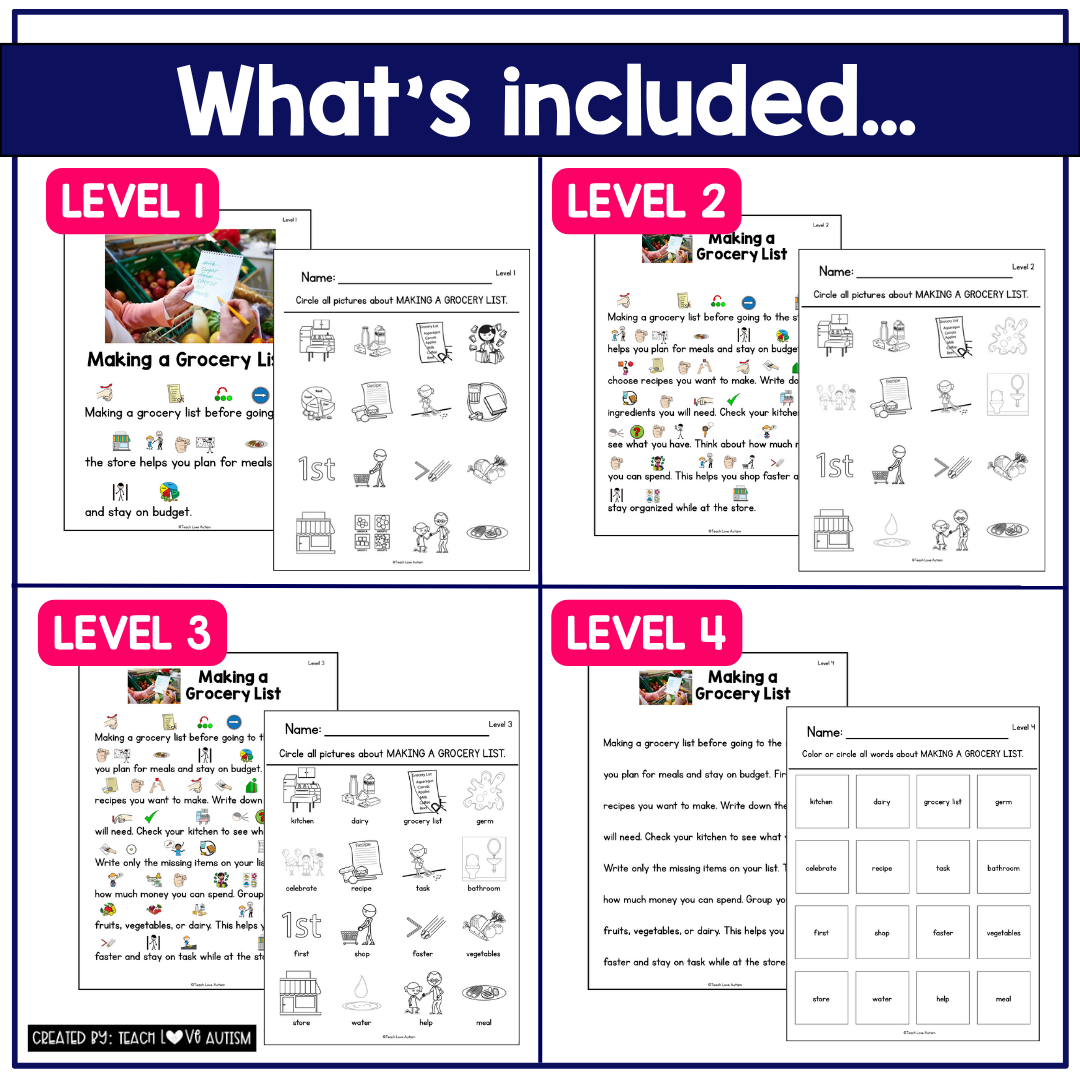 These no-prep life skills reading comprehension passages and questions with visuals are leveled and differentiated to meet the needs of the diverse learners in your classroom. This FREEBIE focuses on the functional life skill of making a grocery list, helping students understand why lists are important and how they are used in everyday life.