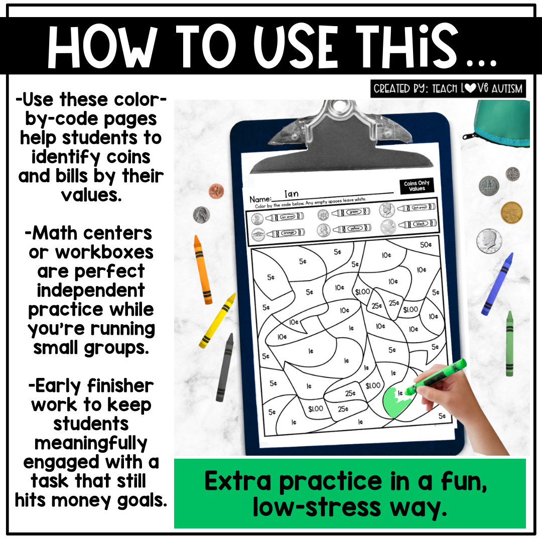 The March Color by Code worksheets are thoughtfully leveled, with 8 worksheets using coins only and 7 worksheets using a mix of coins and bills, making it easy to differentiate instruction or scaffold learning as students build confidence.