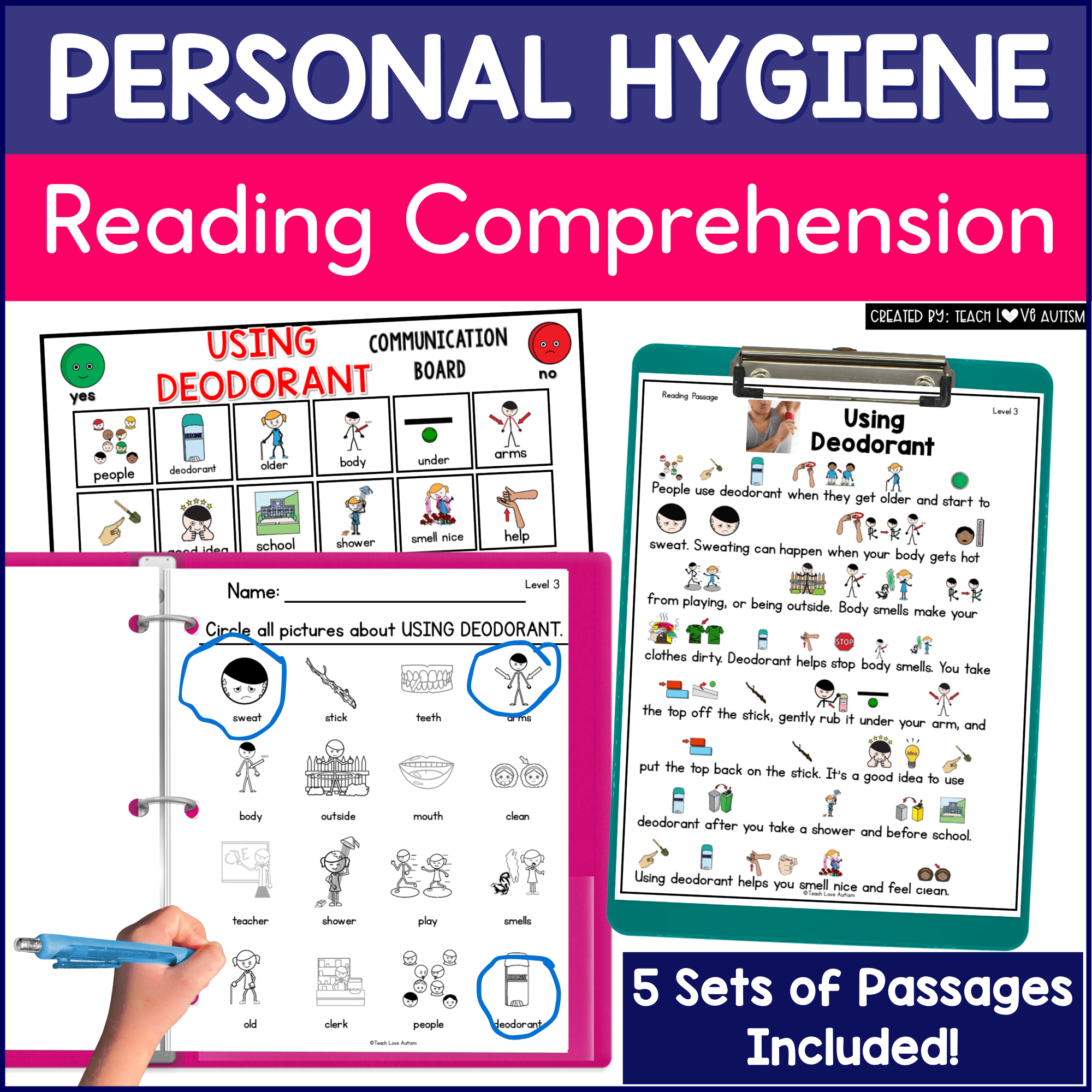 This resource in particular, is themed around PERSONAL HYGIENE! You just print and go and you are ready for 5 weeks of lessons! Each set in the mini bundle is 60 pages of materials on a smaller subtopic. Tackle reading comprehension with ease while focusing on life skills with your students!