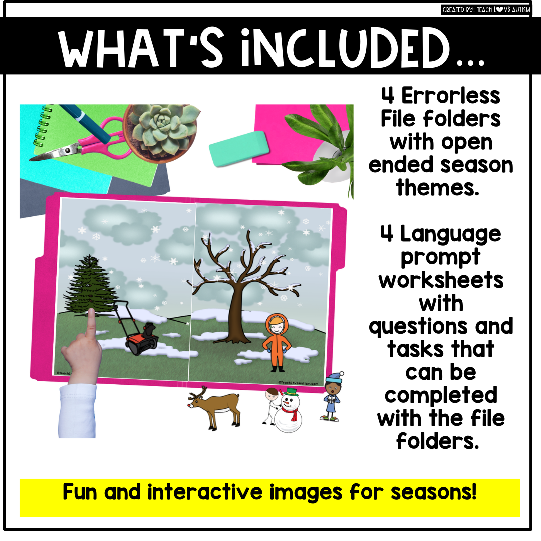 Bring the seasons to life in your classroom with these Seasonal Errorless File Folders packed with rich language prompts and visuals your students will love.