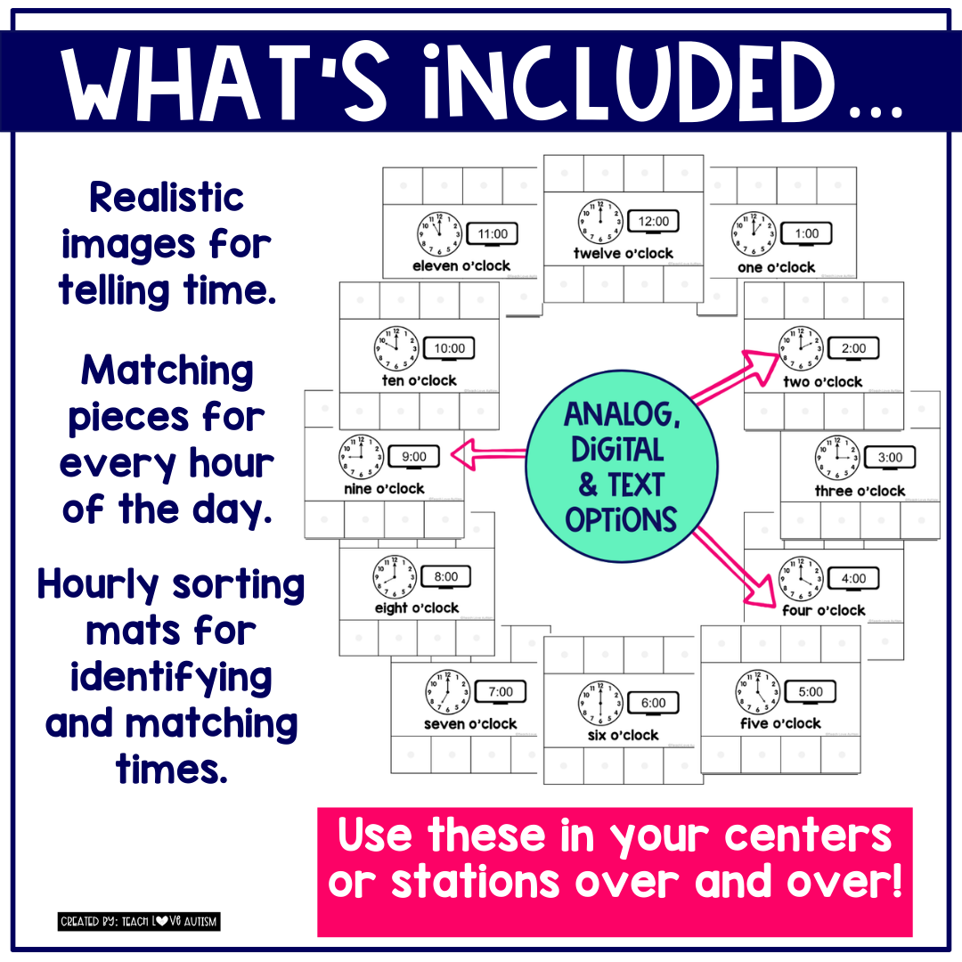 Each of the 12 mats represents a different hour and includes examples of time shown in analog, digital, and word form. Through sorting and matching, students strengthen their ability to recognize and understand various ways time can be represented—an important life skill that supports independence and daily routines.