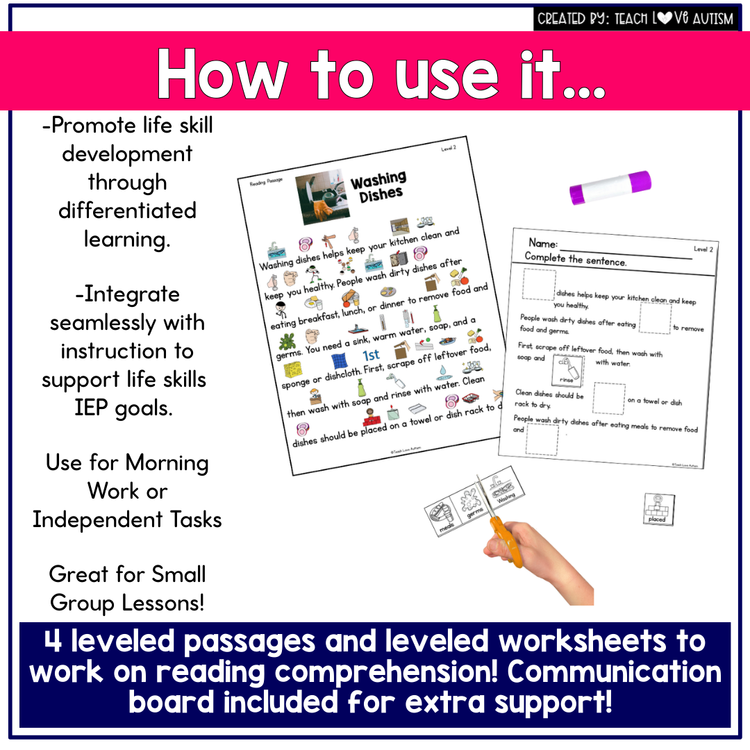 This Washing Dishes Life Skills Reading Comprehension resource offers a structured, accessible way to teach dishwashing routines while strengthening reading comprehension and promoting independence in special education, autism support, and life skills classrooms.